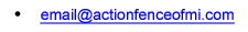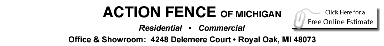 ![]() Thank you for visiting our website; we appreciate the opportunity to bid on your fence project. Action Fence of Michigan has been in business since 1994. We have been installing beautiful fences in many communities throughout Southeast Michigan. There are many reasons to own an Action Fence: We use only the highest-quality materials, from the type of Cedar, Aluminum, Wood and PVC fencing to the grade of cement used for the post holes. Our workers are all United States citizens and Michigan residents, and our team leaders are all bonded and insured. If you haven't already visited our office in Royal Oak, I encourage you to stop by. We have on-site examples of all of the fence products that we sell in many different designs as well as samples of accessories such as finials, hinges and decorative trims. The photo galleries on this website are just a portion of the larger gallery available at our office. Be sure to request a copy of Tour de Fence, our listing of fences that we have installed throughout the Tri-County area; it is available at our office or via fax.