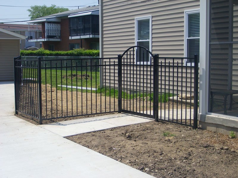 Here is an example of a fence and gate with pressed spear finals protruding through top rail